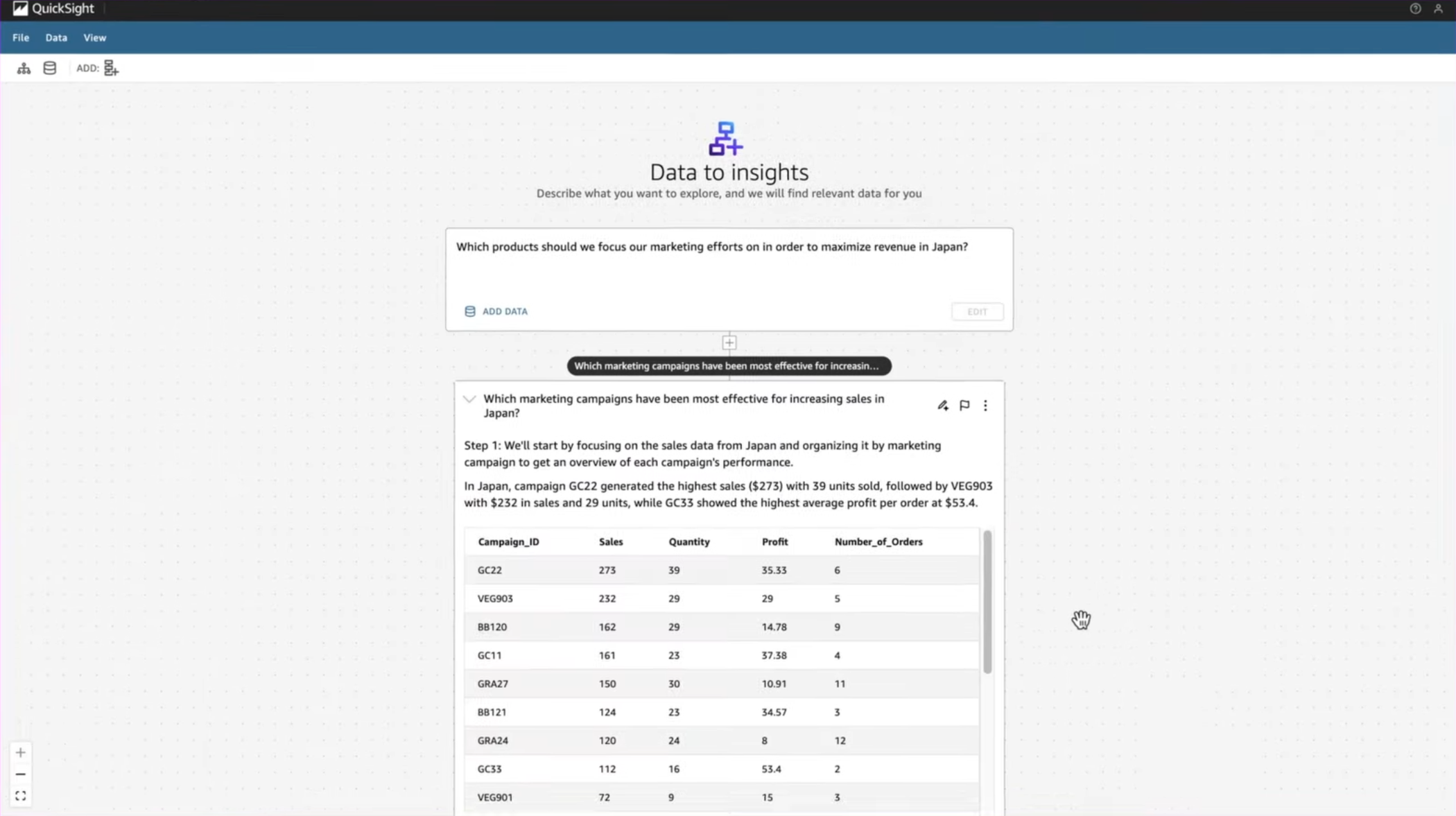 Q in QuickSight is already integrated with multiple large language models (LLMs) running on the Amazon Bedrock service. The AI agent extends the reach of those models to enable business users or analysts to load, for example, a spreadsheet that can be interactively queried to determine what factors led to increased revenues in a region without having any specialized skills. Alternatively, an AI agent can be used to uncover the potential impact a discount program might have on profitability.