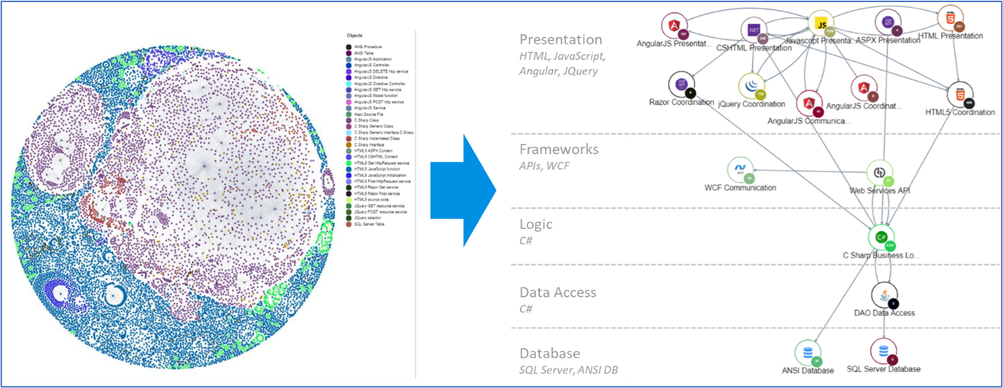 In short, software intelligence technology brings a deep understanding of “as-is” structures. Grounded with this information, AI can be trained about options and patterns for “to-be” architecture.