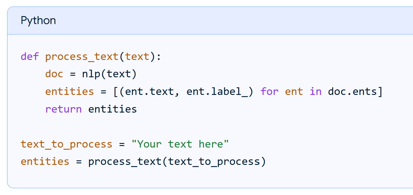 In the Python script, use the loaded spaCy model to process the text and extract the named entities.