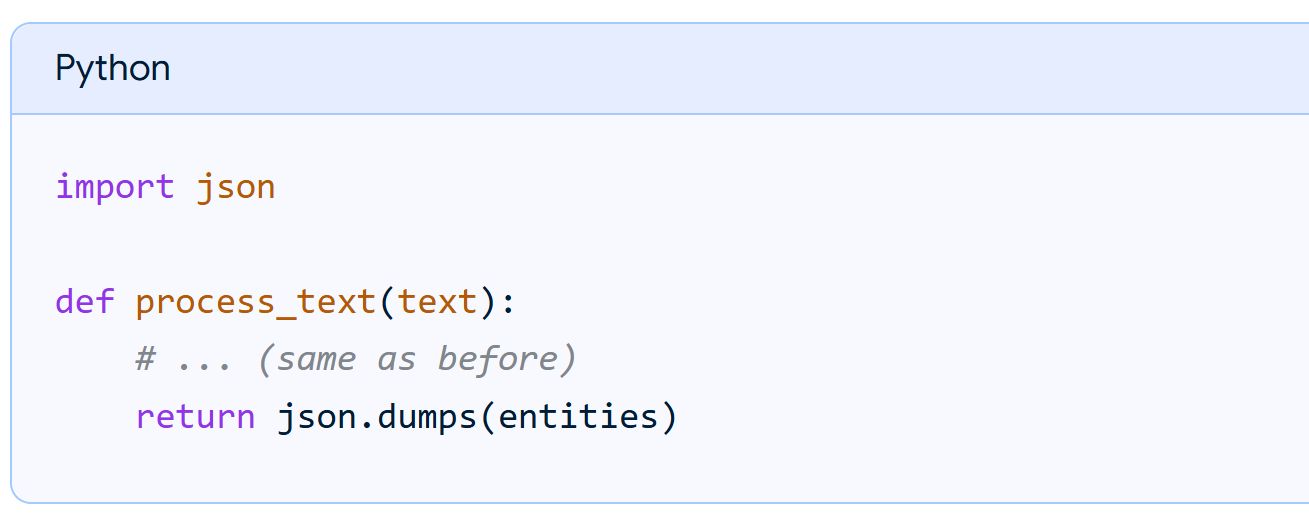 Convert the extracted entities into a JSON string using the json.dumps() function in Python.