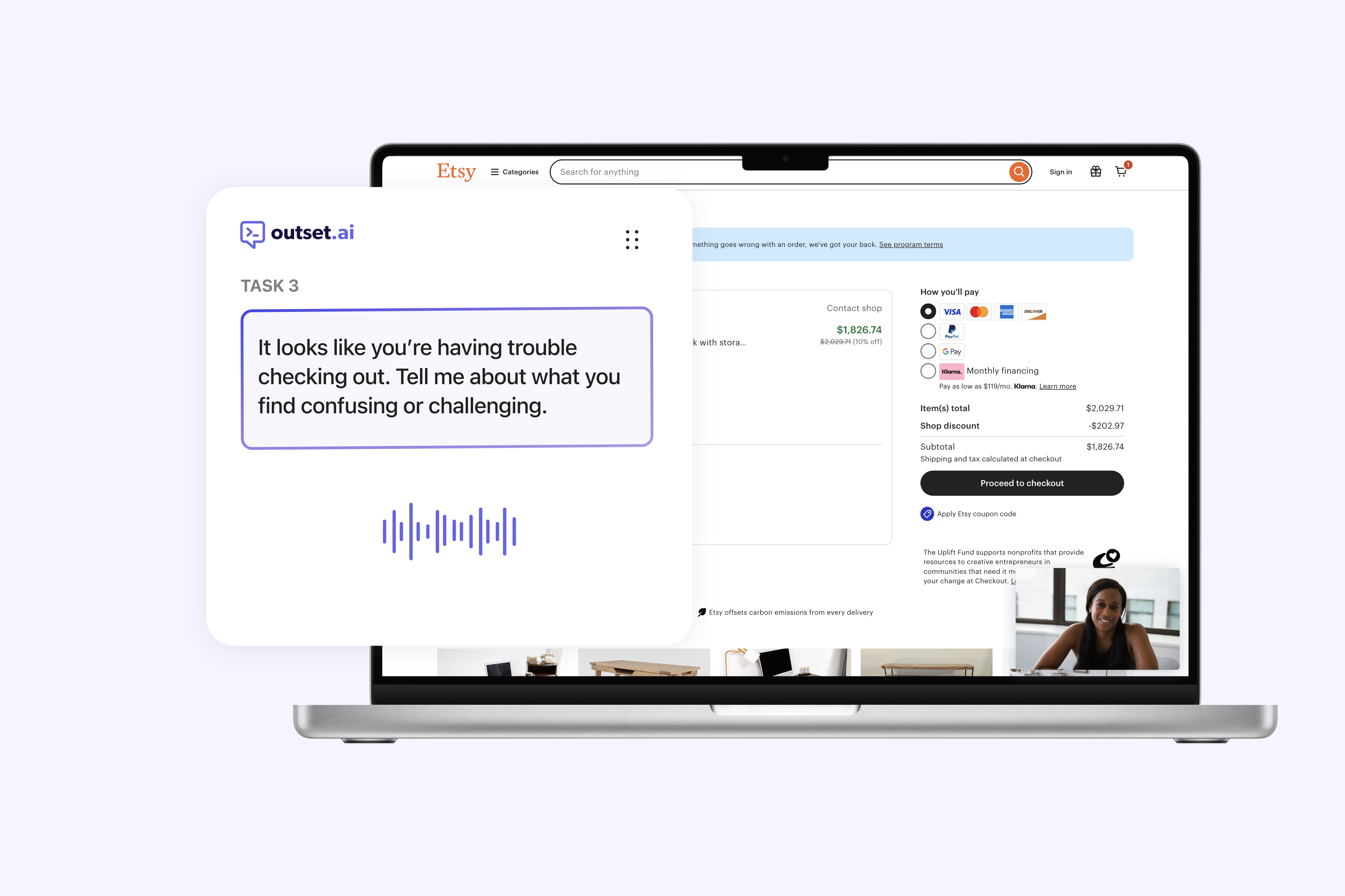 Rather than requiring a human researcher to conduct interviews, the Outset platform presents a video experience through which generative AI is used to engage in conversations with end users. An AI moderator provides an overview and then enables screen sharing via a set of voice and text prompts. As a participant navigates through the product experience on video, the AI moderator follows their movements and asks real-time contextual questions about their experience. It also listens to voice responses from the participant and then asks follow-up questions during an interview session that typically lasts anywhere from 10 to 60 minutes.