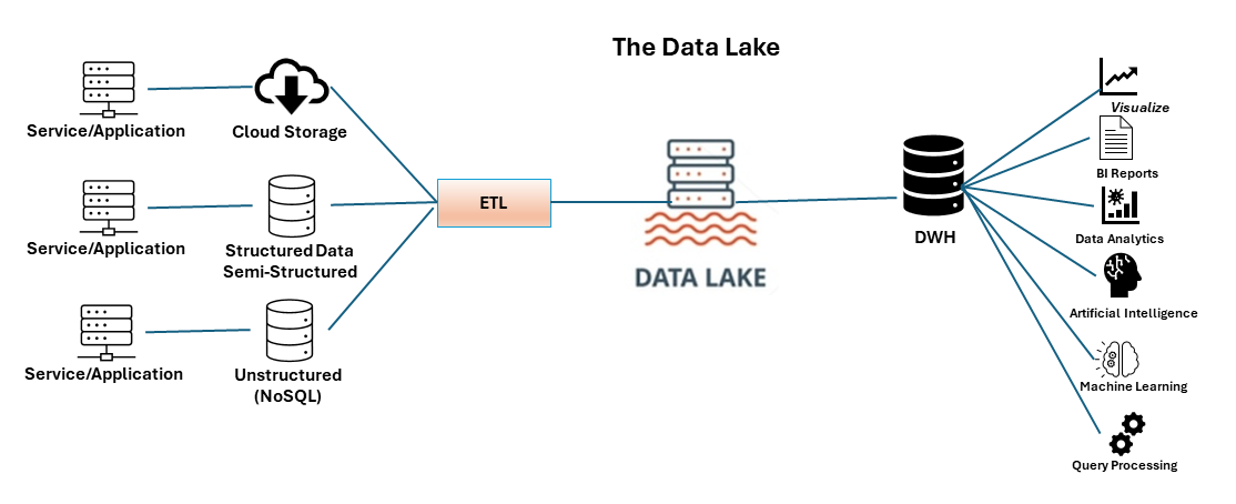 Cloud architecture is a next-gen architecture that primarily includes processing units that implement business logic and virtual middleware and are responsible for communication, session maintenance, data replication, distributed processing and deployment of processing units. Some models support a pay-as-you-go strategy for computing, storage, and service. One example of cloud architecture (Figure 3) is the data lake, in which structured, semi-structured, and unstructured data from multiple sources are stored in secure, centralized repositories. Despite its many benefits, this architecture comes with the intrinsic risk of data swamp, which results from a poorly managed data lake that lacks appropriate data quality and data governance practices to provide insightful learning, rendering the data useless.