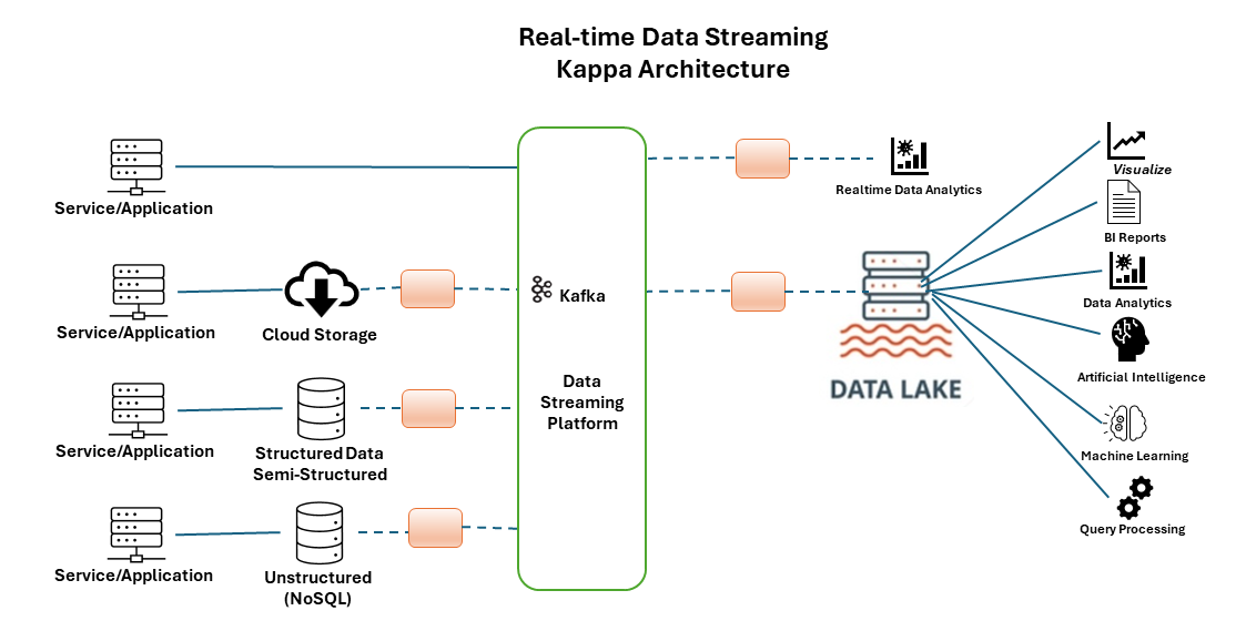 Kappa architecture focuses on handling only real-time data processing, removing the batch processing layer (Figure 6). Kappa architecture is also designed to handle high levels of concurrency and high volumes of data. This simplifies the stack but requires strong stream processing capabilities. This architecture is used when simplicity and reduced latency are priorities.