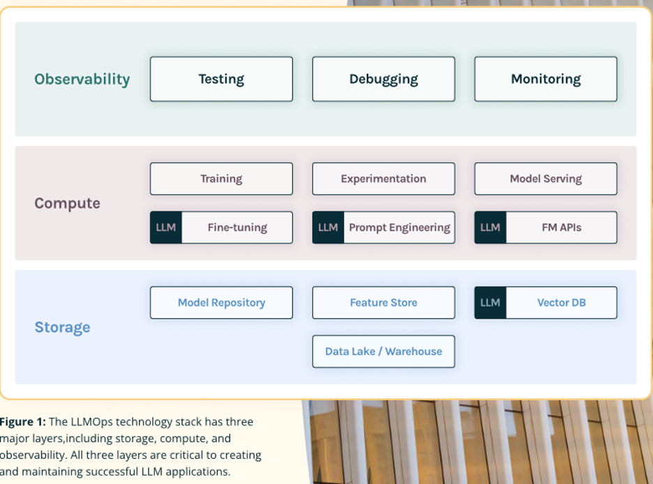 Observability consists of testing, debugging and monitoring. Compute consists of training, experimentation, model serving, fine-tuning, prompt engineering and FM APIs. Finally, storage consists of model repositories, feature stores, vector DBs and data lakes/warehouses.