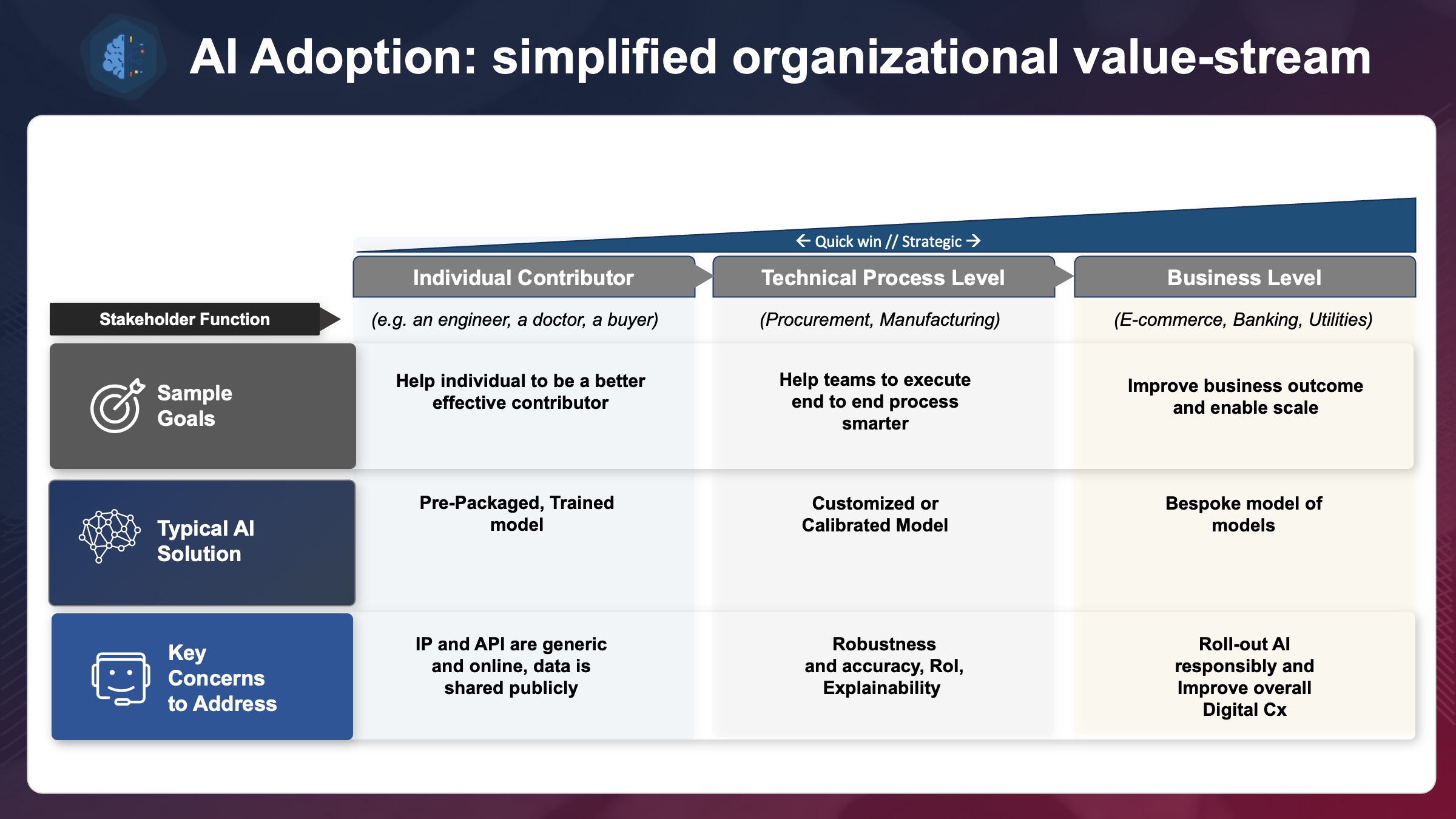 Companies looking to incorporate AI into their practices should follow a three-layer approach that prioritizes quick wins at the ground level, which will generate trust, a sense of capability, and enable lessons learned and calibration before scaling up through the enterprise level.  Implementing AI in internal facing processes and in DTC can showcase the value add vs. complexity, and expose hidden challenges that might arise from adopting new technologies (e.g. skills availability, infrastructure gaps, know-how, etc.) These quick wins can be accelerators for improvement of developer experiences, and transition basic manual or rule-based software business processes to be ML-Powered.