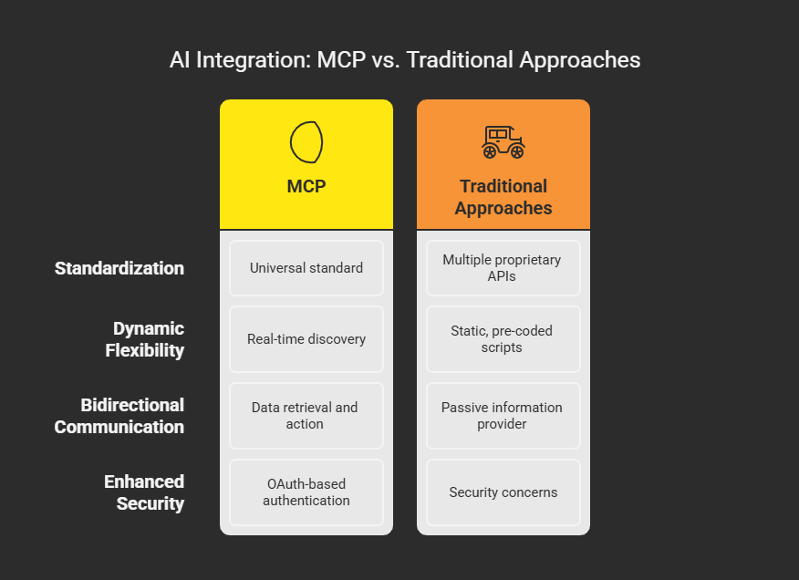 This comparison highlights the significant advantages of the MCP approach, particularly for organizations that need to integrate multiple data sources and tools with their AI systems.