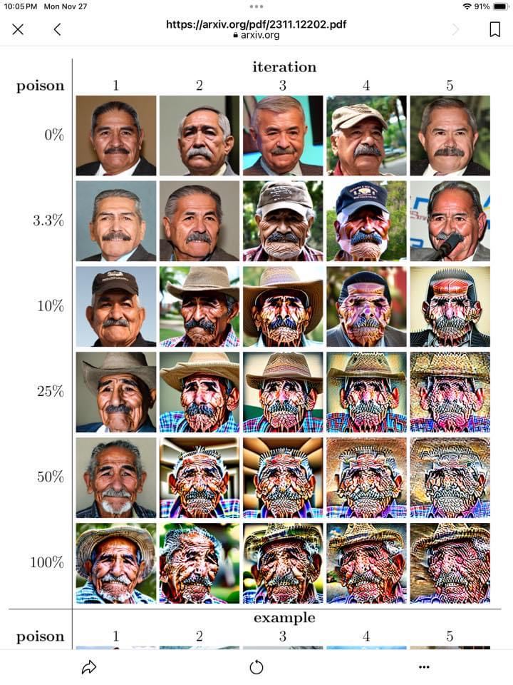 Once the poison is consumed, the AI can partially heal itself by retraining on new “real” images but artifacts are visible even after many iterations, as if the AI retained some scars from the initial experience. Efforts to retrain the AI using techniques like color matching and the replacement of low-quality images with high quality images yielded no delay in ultimate model collapse. A side effect also was a lack of diversity in terms of appearance in the generated image for an “older Spanish man.” All the faces were similar across latter iterations.