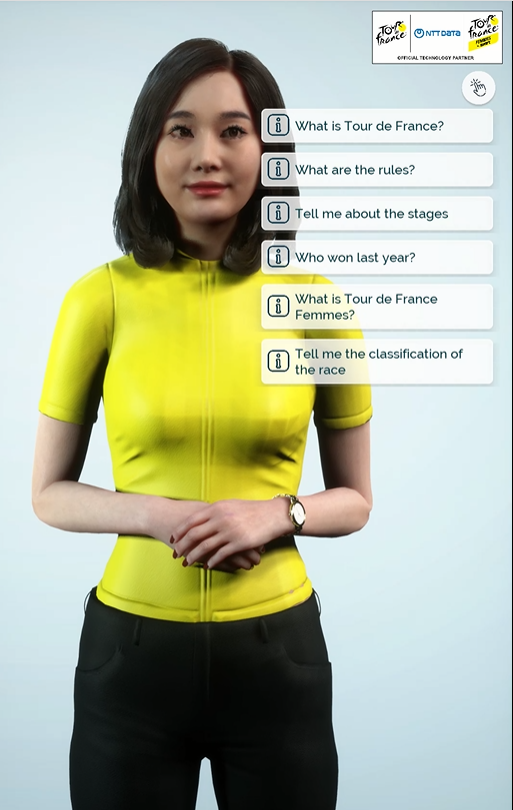 Marianne “is trained on previous coded race information and leverages ChatGPT to provide a unique user experience for responses that have not been pre-coded,” explains Joan Kuhrmann, director of program management at NTT. “What’s exciting about Marianne is her ability to leverage real-time data through NTT’s data analytics platform to answer real-time, race-related questions. For example, she can access data around the current stage, the kilometers remaining to the finish line, speed and weather data, etc. She can also give an explanation of the route, answer who is currently leading the stage, if and when there is likely to be some action in the peloton and more.”