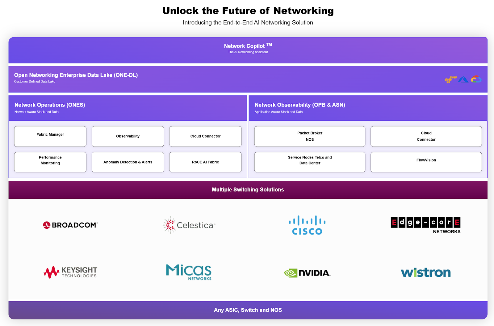 ONES utilizes an intent-based management and automation model, where users define the desired state of their entire network fabric, rather than configuring devices individually. This is crucial for efficient operation of complex AI networks with thousands of compute nodes, switches, and connections.